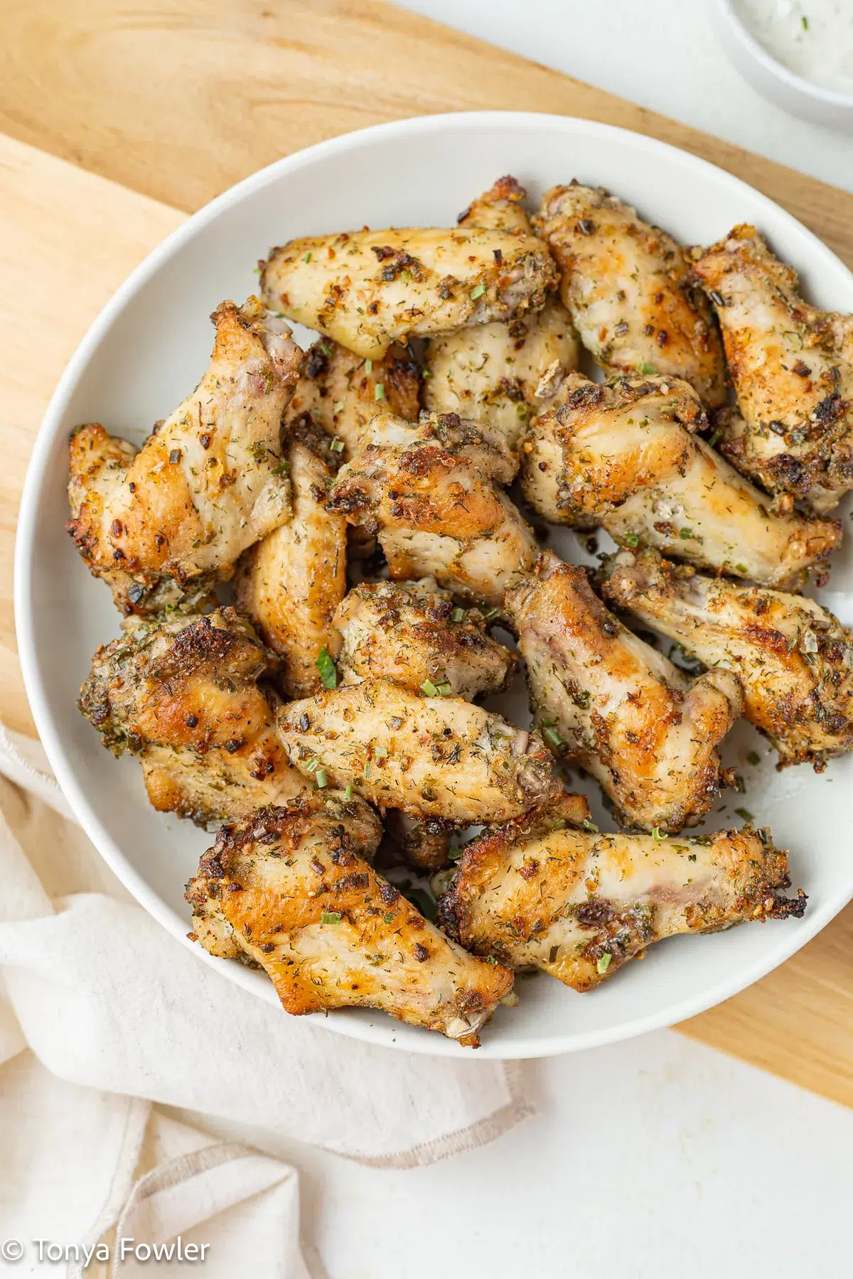 These Baked Ranch Chicken Wings are crispy and herby and have all the flavor of ranch dressing! Baked on a wire rack so they get extra crispy, these dairy free ranch wings are the ultimate game day appetizer served with homemade ranch dip and Air Fryer Potato Skins.