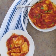 I love to serve homemade ravioli with a garlic basil tomato sauce using fresh tomatoes and freshly torn basil leaves and grated cheddar cheese.