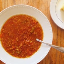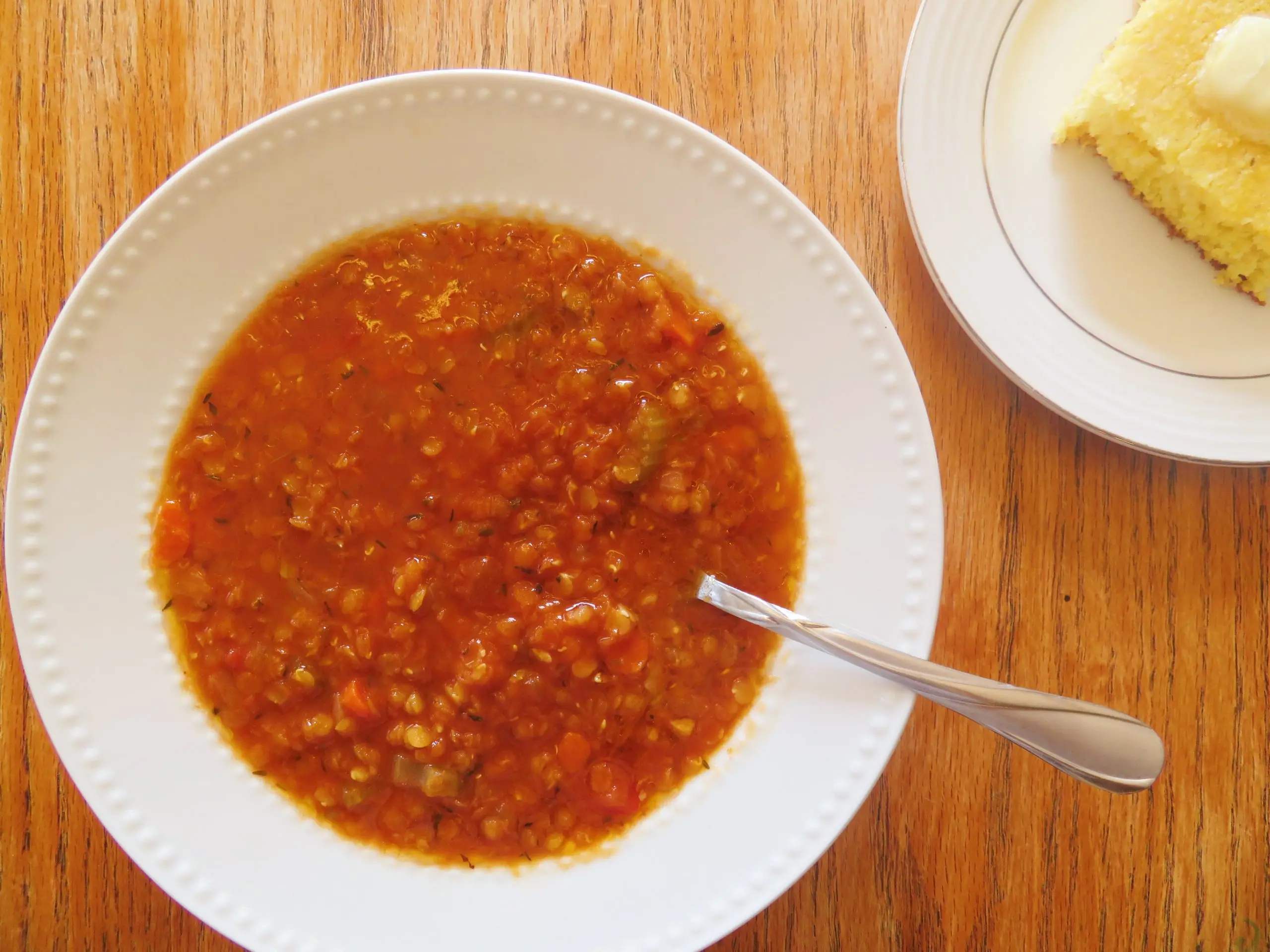 Serve this Tomato Red Lentil soup with Rosemary Polenta cornbread or Skillet Cornbread for an easy and delicious meal.